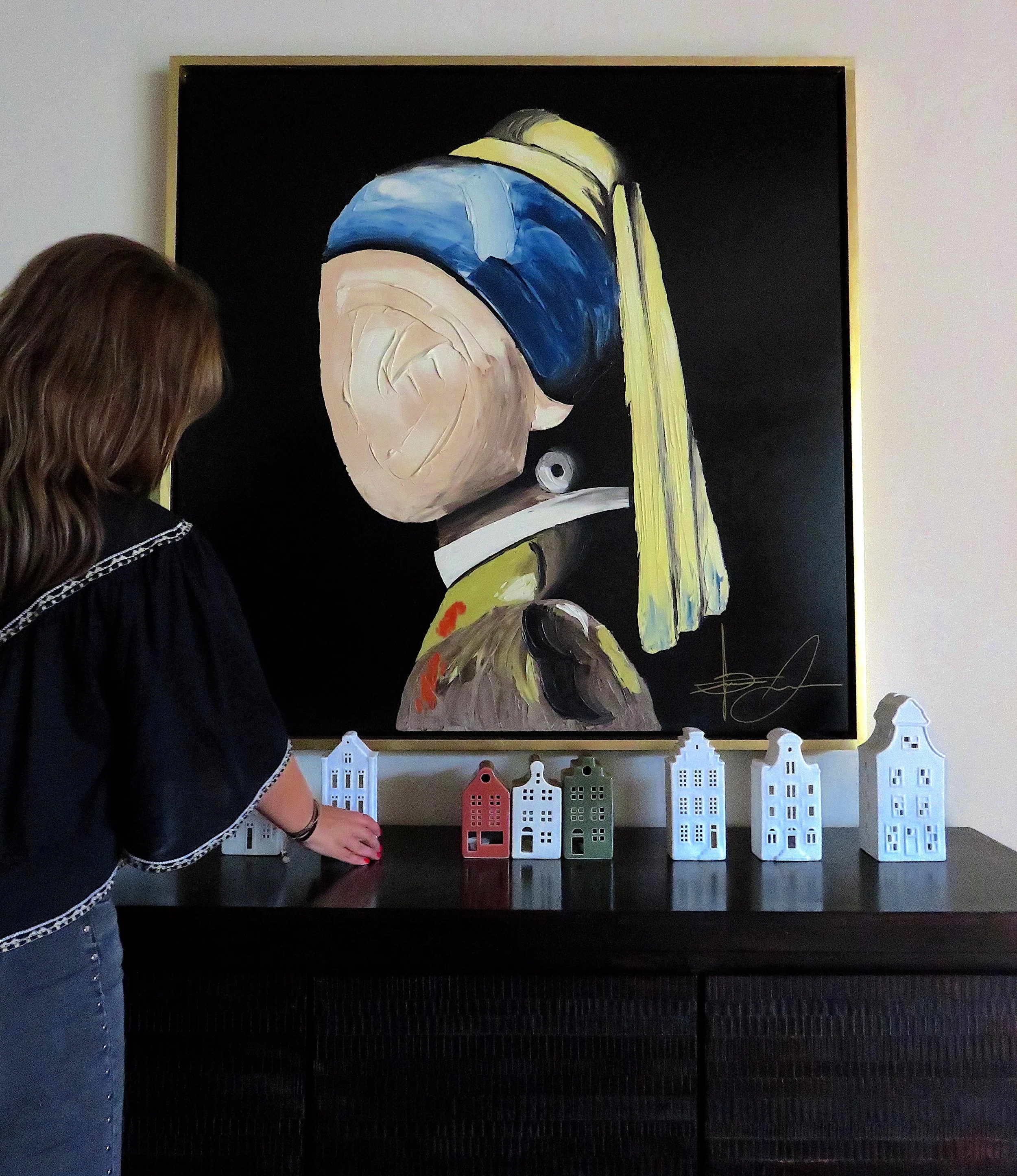 A woman with brown hair looking at a large abstract painting of a woman with blonde hair, a blue headscarf, and a yellow coat, hung on a wall. On a black table below the painting, there are small decorative houses in white, red, and green colors.