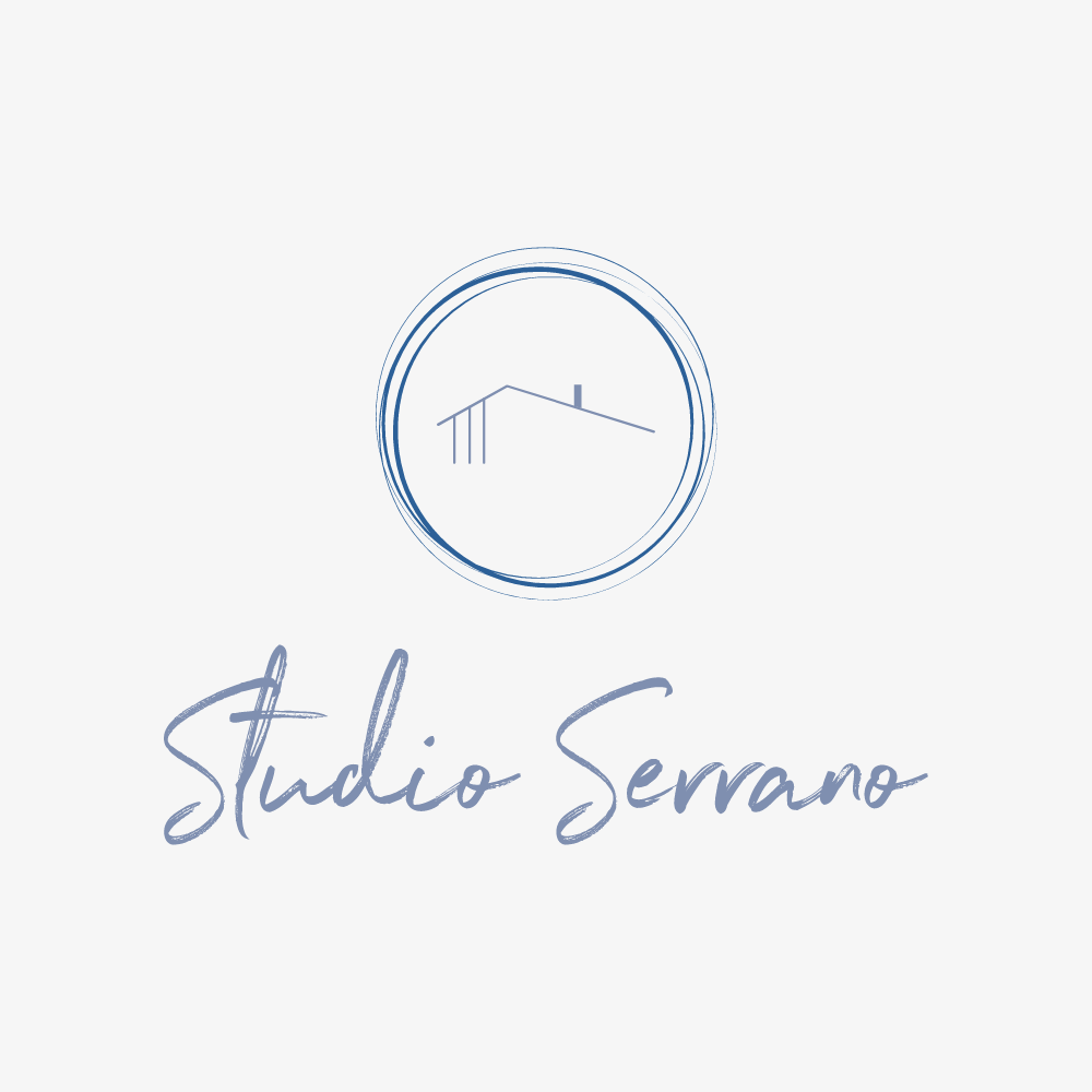A minimalist logo with a circular outline featuring an outline of a house with a chimney inside. Below the circle, the text reads 'Studio Serrano' in a handwritten style.